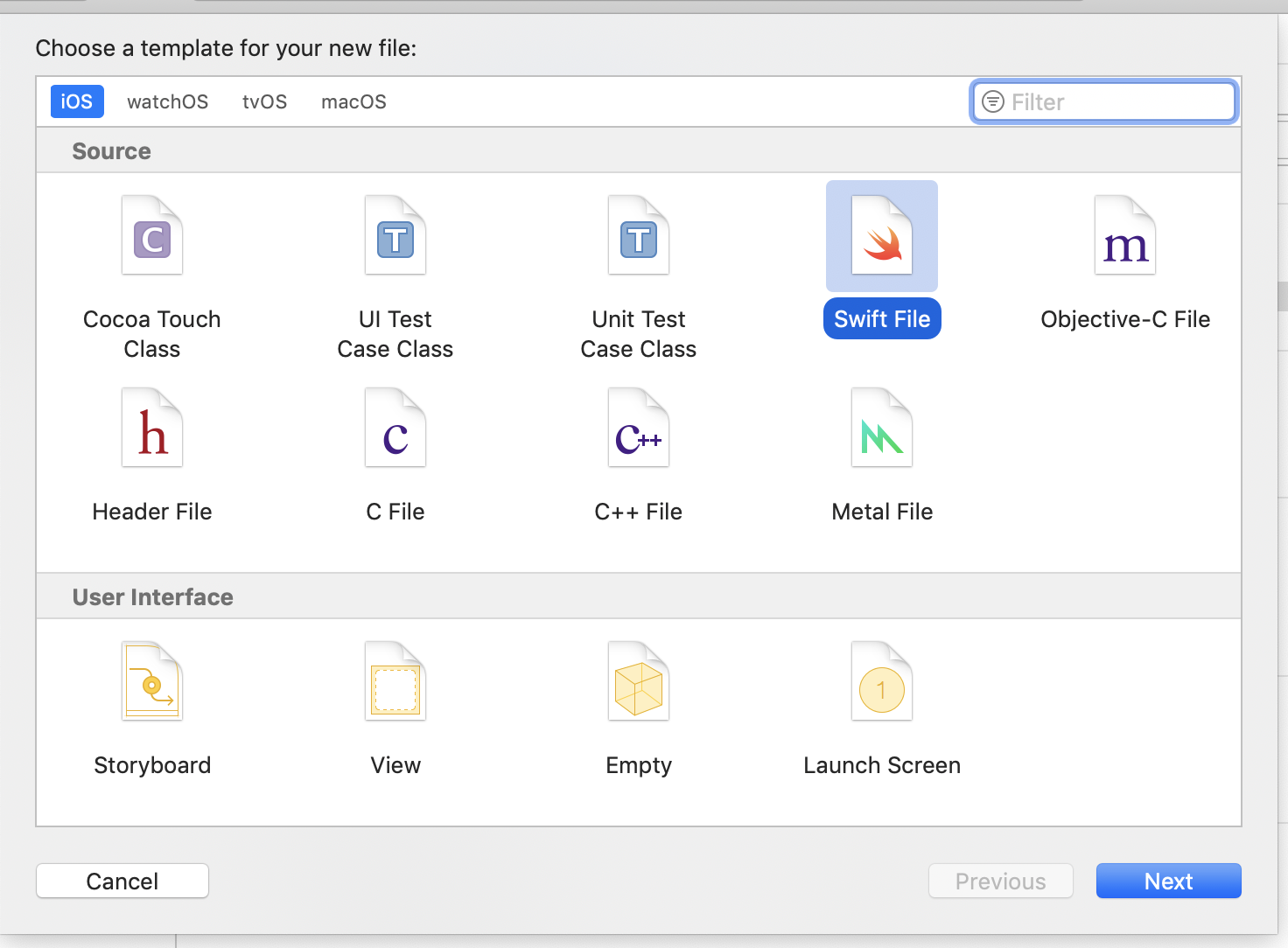 In the Choose a template for your new file window, select iOS and Swift File.