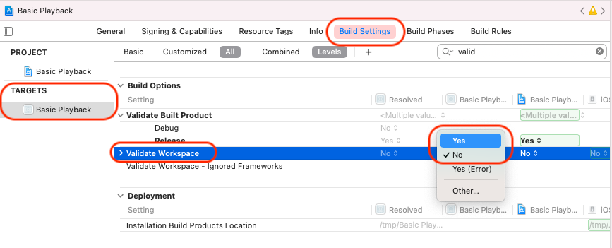 3. You should also set the build flag Validate workspace to Yes as shown below.