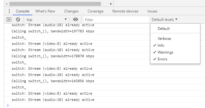 When viewing logs in the Developer Tools environment, the volume of log output can be controlled by the standard filtering options provided, such as that shown below with Chromium-based environments:
