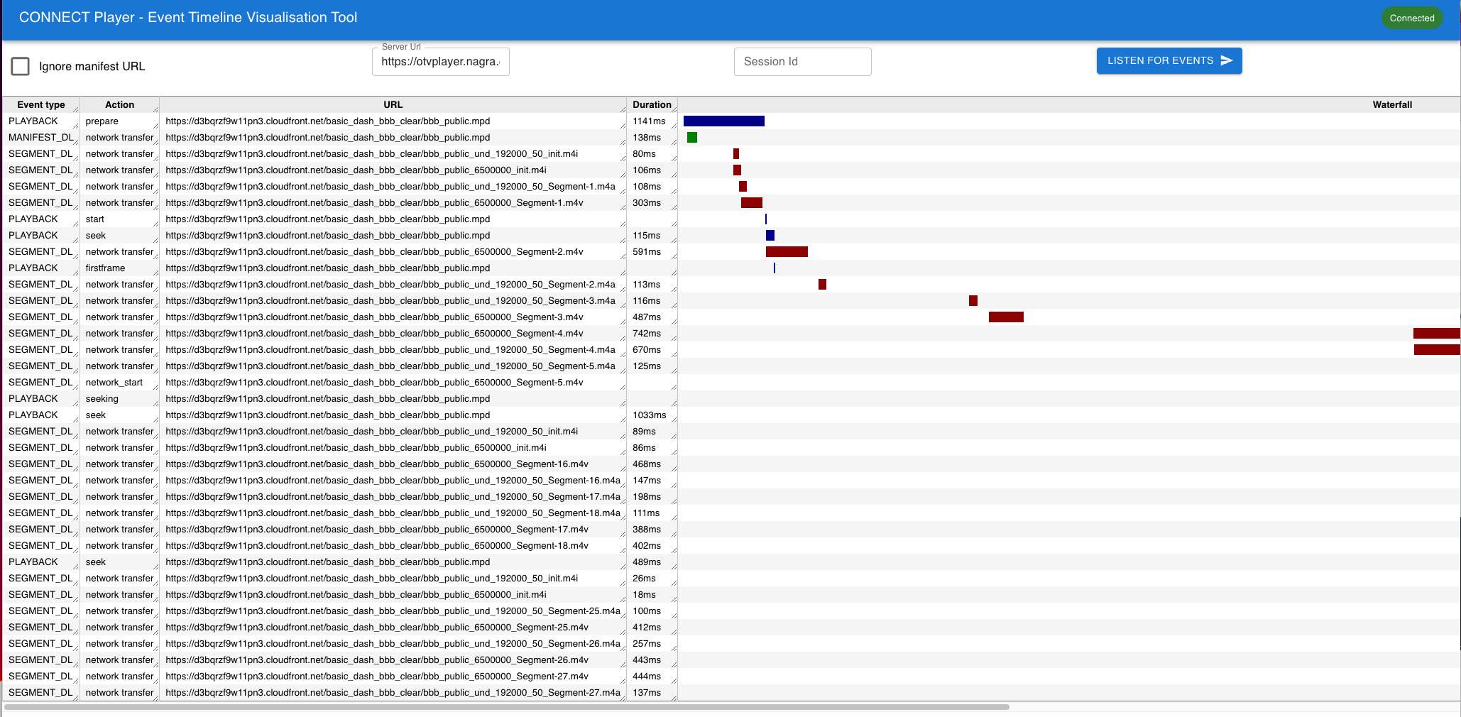 Many CDNs redirect the manifest download to a different URL, leading to different URLs being reported for the start and end of a manifest download. The result is that the visual timeline will show the manifest download as start and complete events rather than a single transfer.