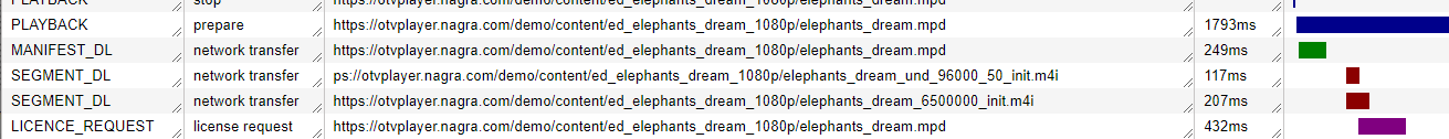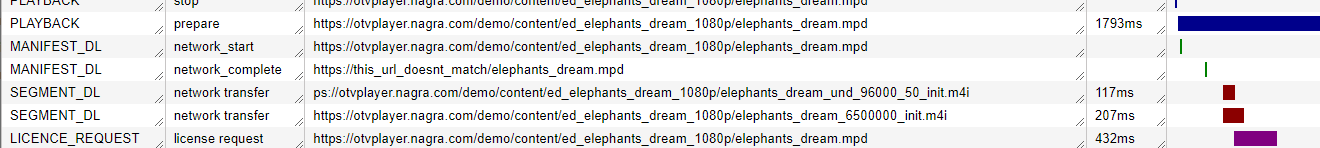 Many CDNs redirect the manifest download to a different URL, leading to different URLs being reported for the start and end of a manifest download. The visual timeline will show the manifest download as start and complete events rather than a single transfer.