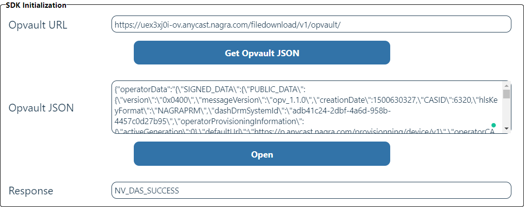 To create a new Session that can be used in subsequent operations, in the SDK Initialization section, enter the URL or the contents of the OpVault and click Open.