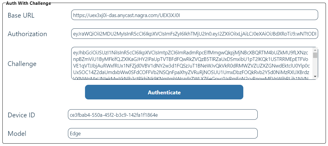The URL of the Gateway, the authorization token, and the previously obtained token are displayed. In the Auth With Challenge section, click Authenticate to confirm the Device Id and Model are authenticated correctly.