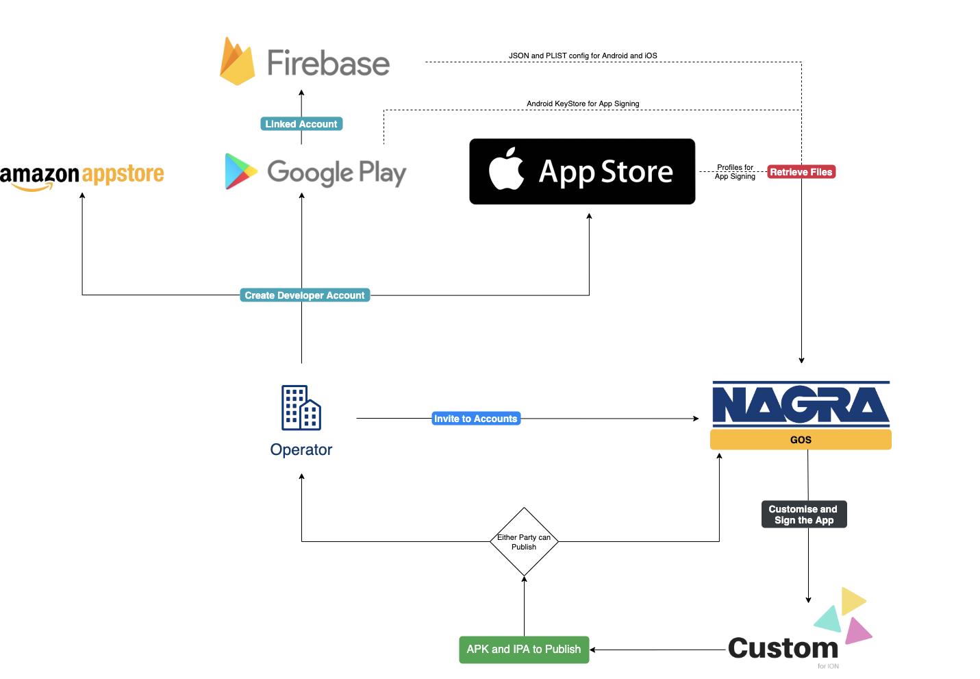 - They can choose to handle the signing process of the application themselves; they will need to provide the configuration files from Firebase, and detail the customisations they'd like of the app to allow NAGRA to deliver an application that the operator will need to sign and submit to the app stores themselves.