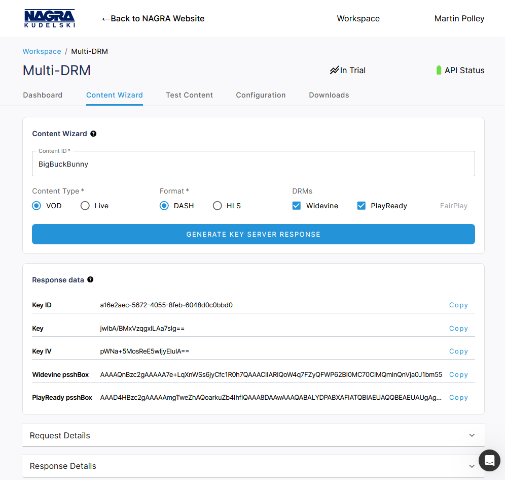 The NAGRA Multi-DRM portal provides some tools to help you get started with interacting with the Key Server without requiring any complex setup. It generates all of the details required by a packager with a single button click. The complete mDRM documentation provides details on more advanced use cases and different Key Server API endpoints.