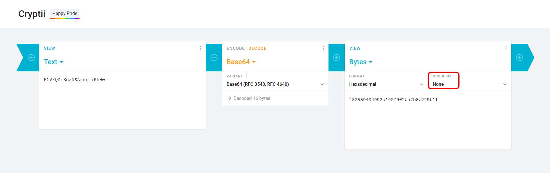 In the above example, you can see that the key has been converted from the Base64 value of KCVZQ0mSoZN5ArorjiKbHw== to a hexadecimal notation of 282559434992a1937902ba2b8e229b1f. The same conversation needs to be performed on the iv to give the output of aed883768569074a238fcdb190c9956a.