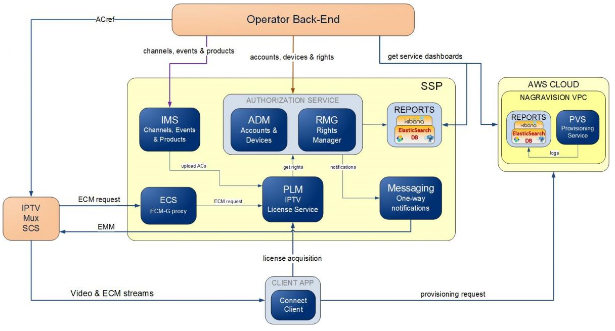 This page gives an overview of the different services composing SSP combined in different configurations. The "SSP Platform" part can be either hosted by NAGRA in AWS as part of the NAGRA SaaS offering or it can be hosted in the operator private cloud. For completeness, the diagrams include as well the Provisioning Service (PVS), hosted by NAGRA in AWS, although this element is not part of the SSP platform and is not deployable in private clouds.