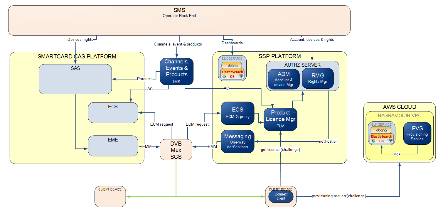 The following diagram covers the typical deployment of SSP for DVB use cases in a simulcrypt configuration with a legacy smartcard-based CAS. A converged IMS is used to define products for live channels for both SSP and the smartcard-based CAS. ADM and RMG are used to authorized the access to products defined in IMS in SSP, the legacy interface is used for the smartcard based CAS.