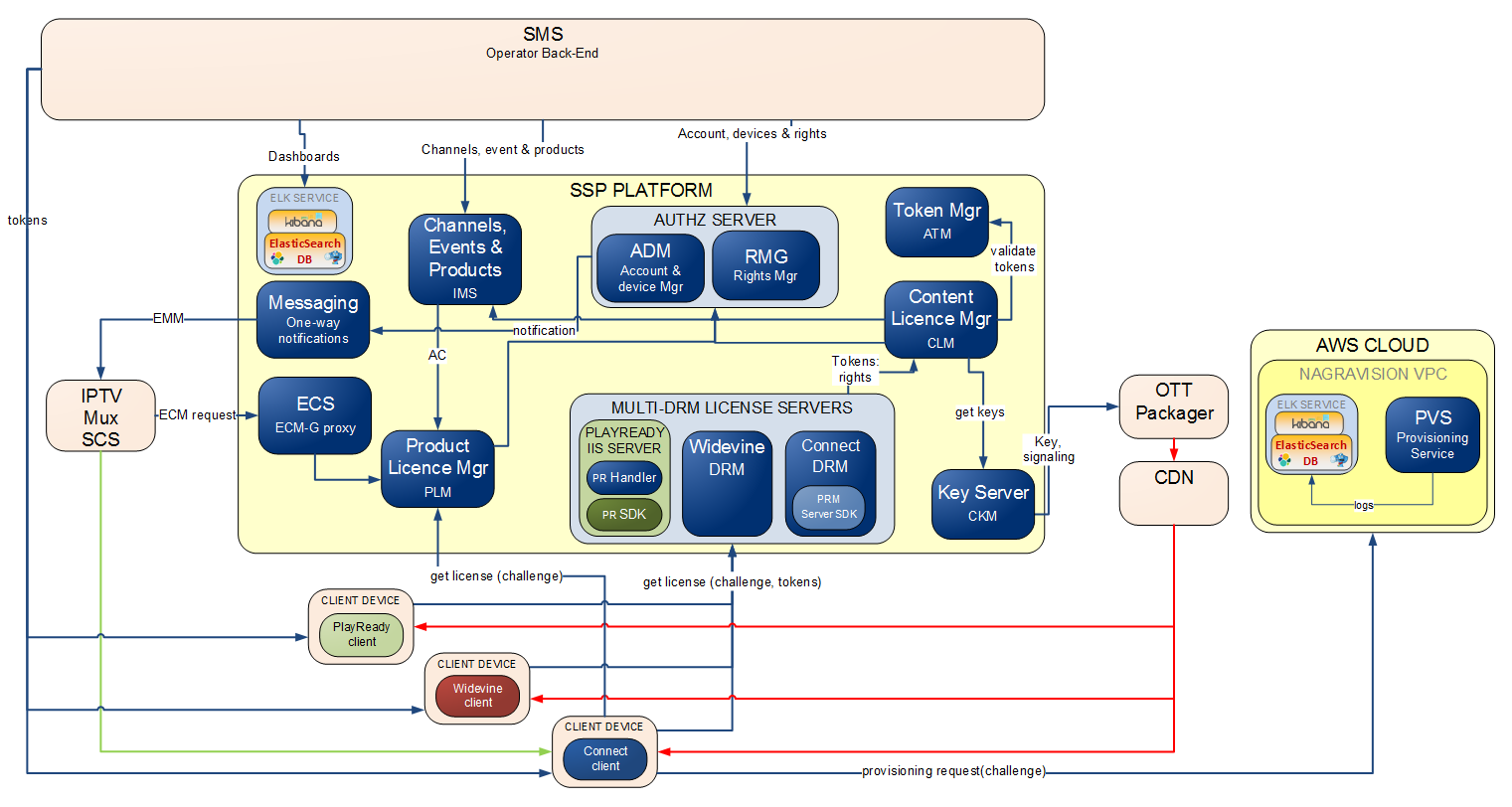 The following diagram covers a green field SSP deployment supporting both OTT and IPTV/DVB use cases. IMS is used to define products for live channels independently of their transport mechnanism. ADM and RMG are used to authorize the access to products defined in IMS. OTT VOD are handled using CLM authorization tokens.