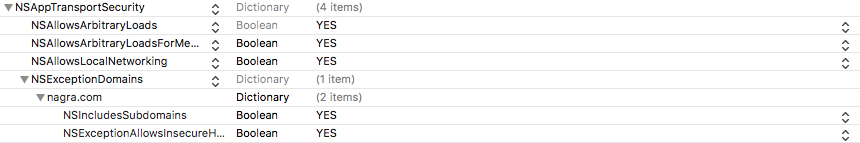 - NSExceptionAllowsInsecureHTTPLoads (boolean) YES