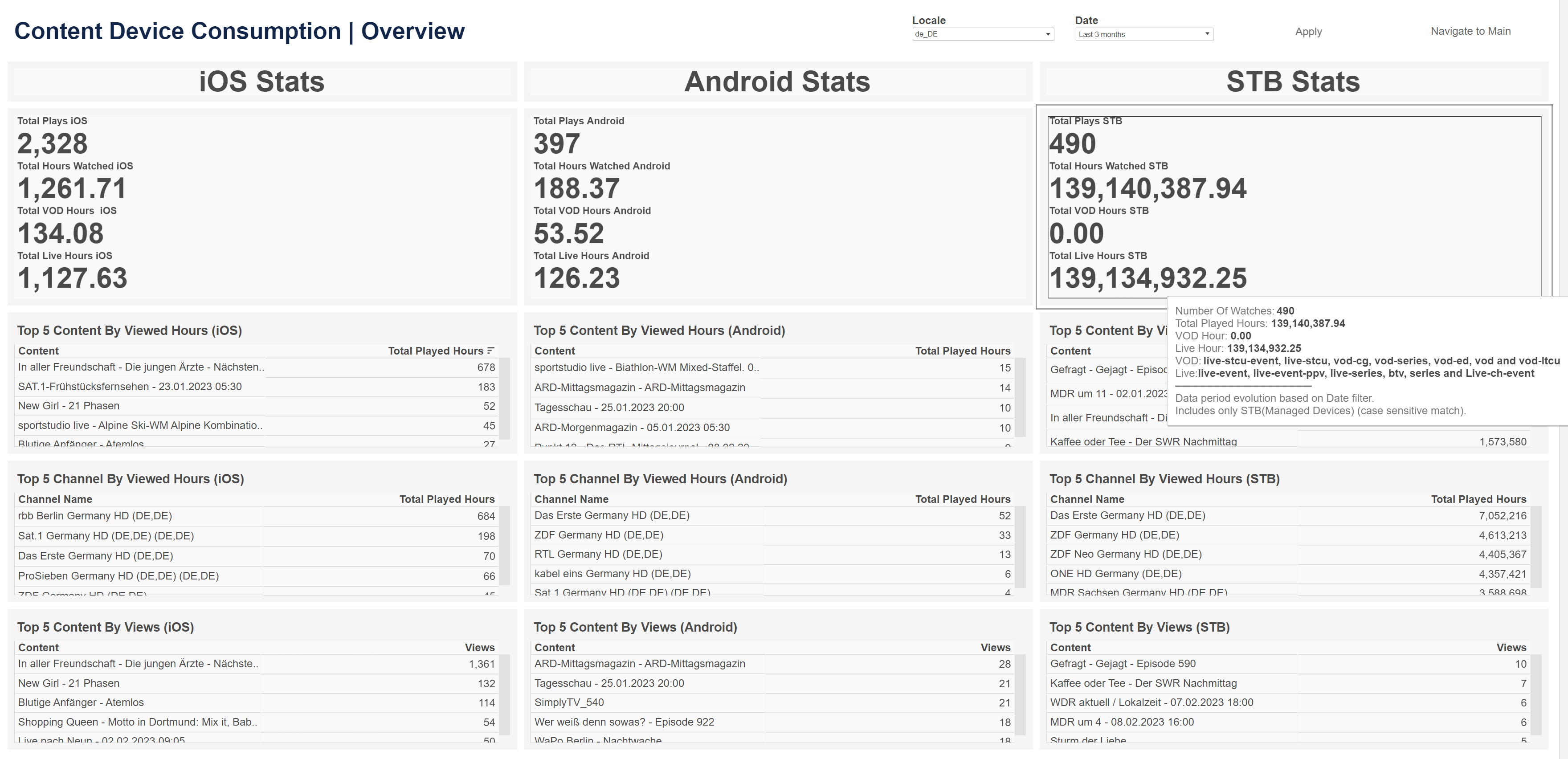 • Total hours watched, VOD hours watched, and live hours watched per platform (iOS, Android, STB, and others)