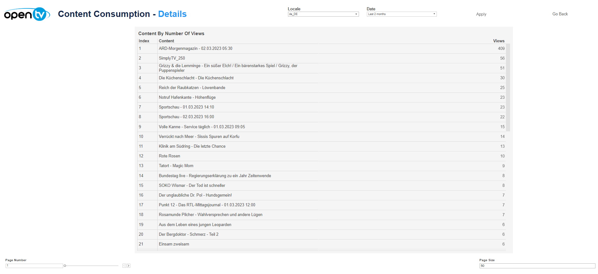The Content by Number of Views tab displays a list of content, ordered by total number of views. For each content, it shows: