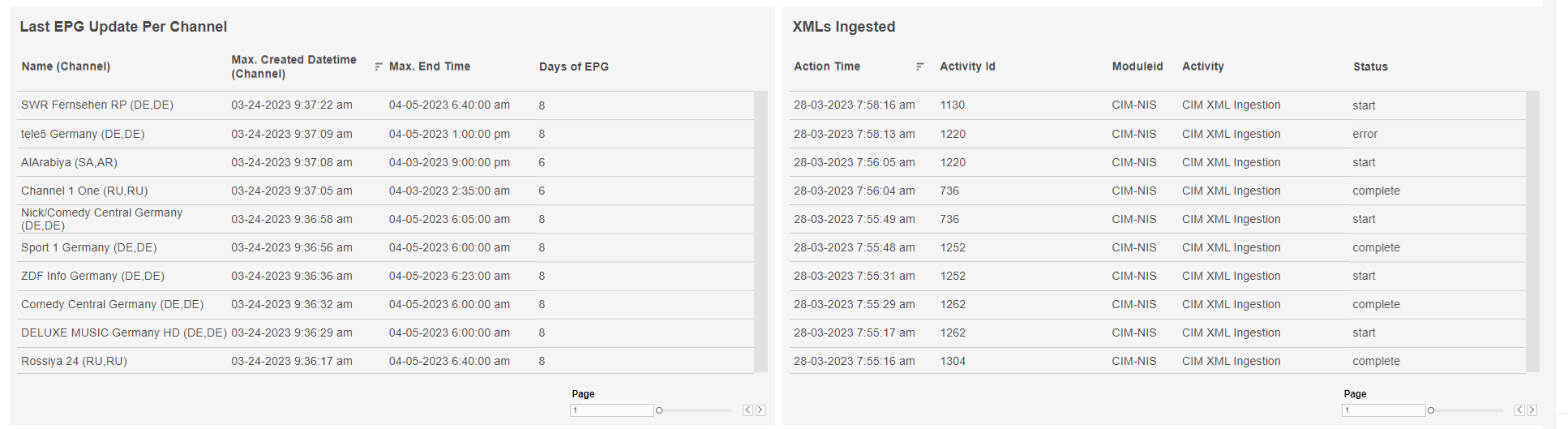 The checkboxes on the left allow you to view data for specific modules. - A table listing the most recent EPG updates per channel, including the number of days of EPG availability for each channel