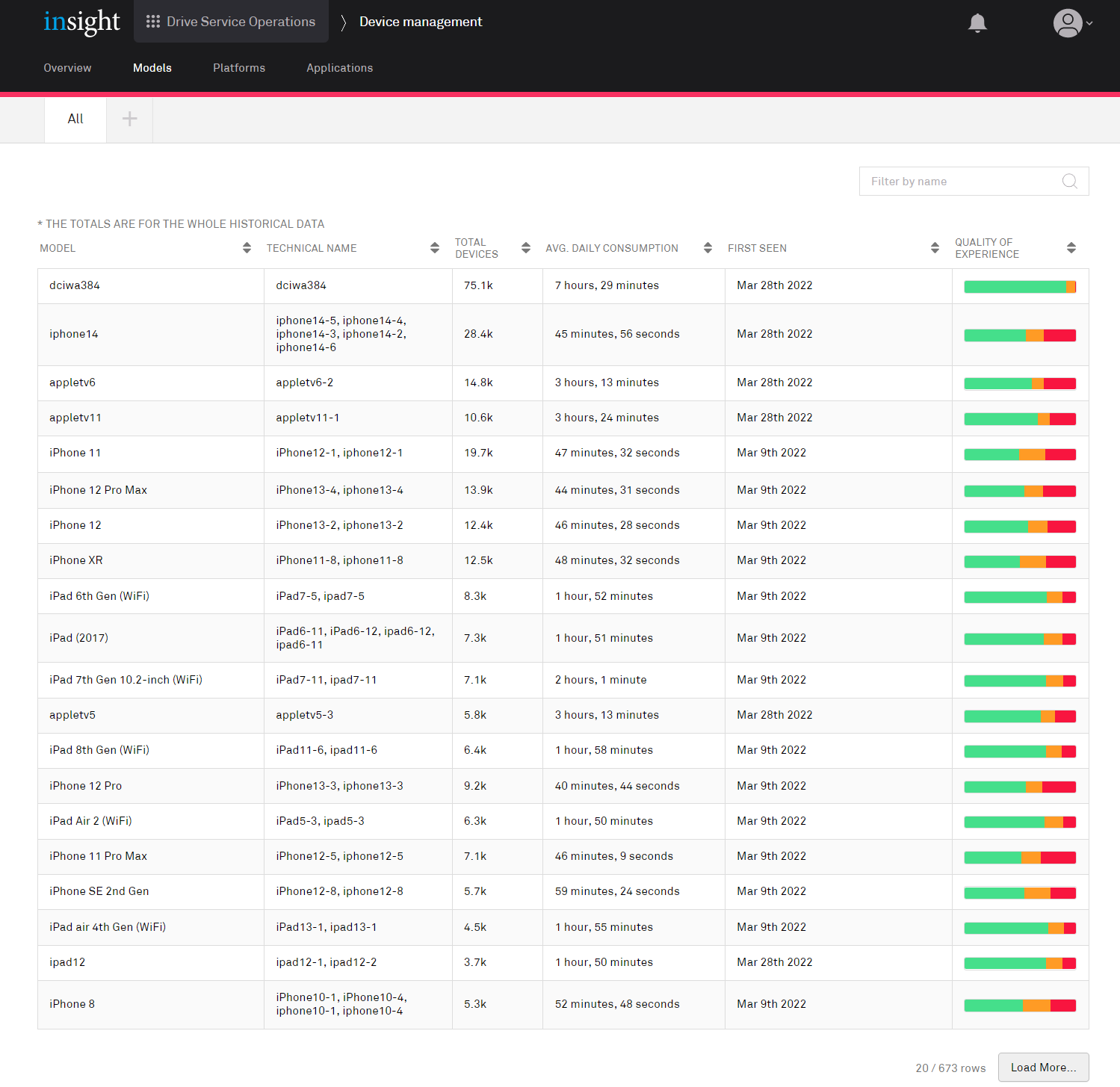 This page shows the device models in use; clicking a row in this table opens the detailed information page for that model.