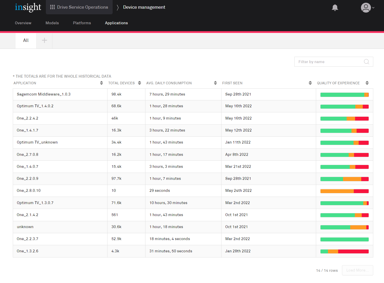 This page shows the applications in use; clicking a row in this table opens the detailed information page for that application.