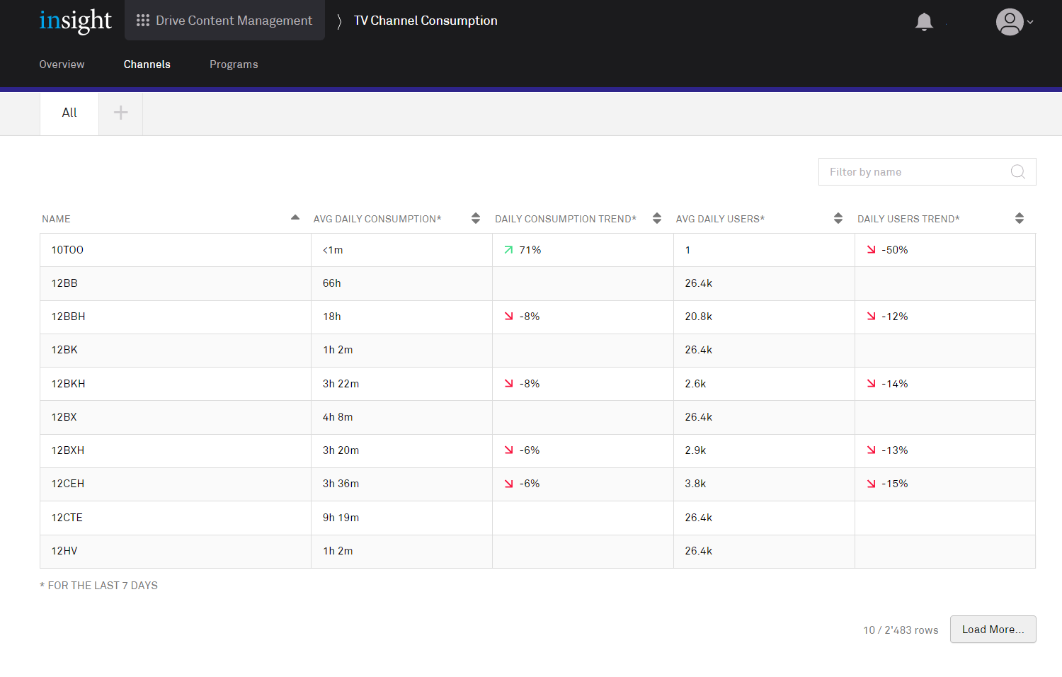 Data displayed in the table is for the last seven days, regardless of the range selected on the Overview (TV) page.