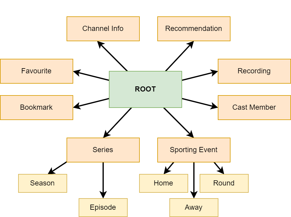 The diagram describes the content roots for the possible media card types. For example, a VOD item can be delivered by a Recommendation or by a Bookmark. This API enables the client to aggregate away / facade the calls to assemble the root content when building media card types.