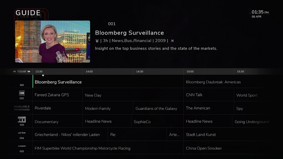 The guide screen shows a traditional guide format to allow users to discover content in a familiar way. OpenTV Video Platform also provides the ability to create dynamic channels to promote recommended VOD content.