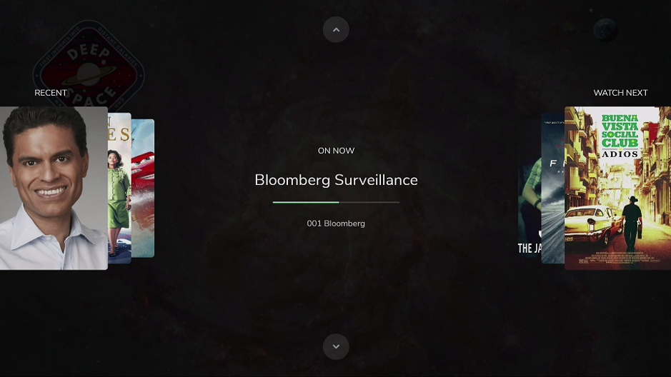The timeline feature is the simplest UI made for TV – a linear navigation to past, present and (possible) future viewing. The currently playing item is shown in the middle of the screen. Users navigate left to see their recently watched items – a mixture of live, on-demand, and episodic content. Users navigate right to see recommendations specific to them, again a mixture of live, on-demand, and episodic content.