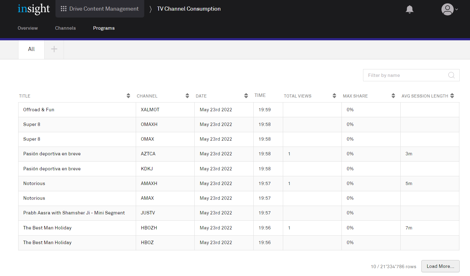 This page displays the program data. The default view is a table of ten rows. Operators can order the table in the normal way by: