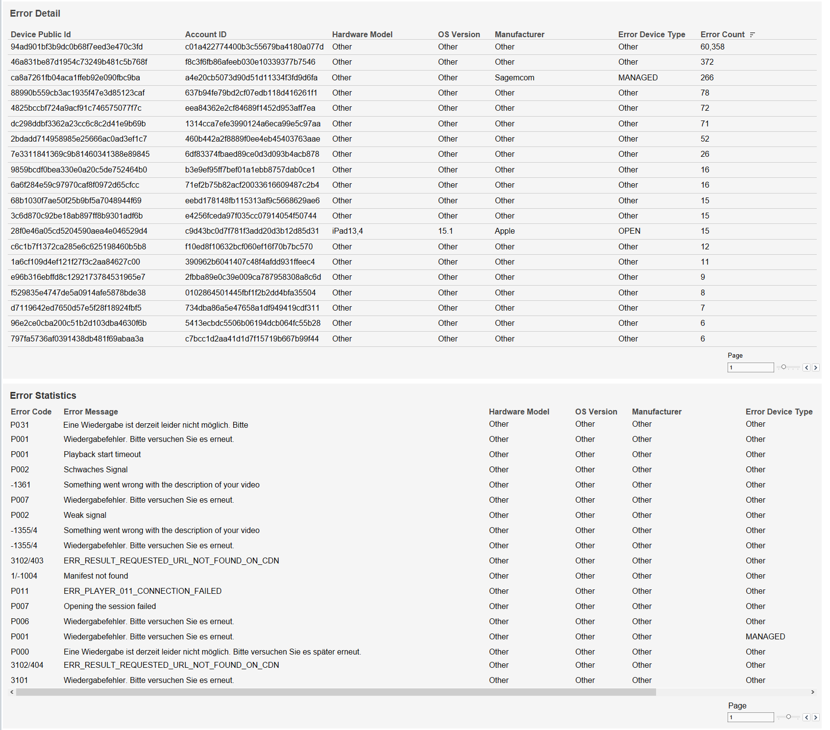 - Error code detail – table listing error occurrences with error code and device details