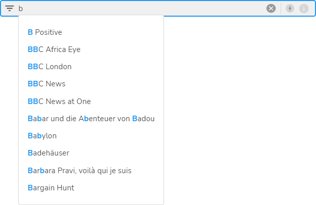 Characters typed in are highlighted in blue in the search results.