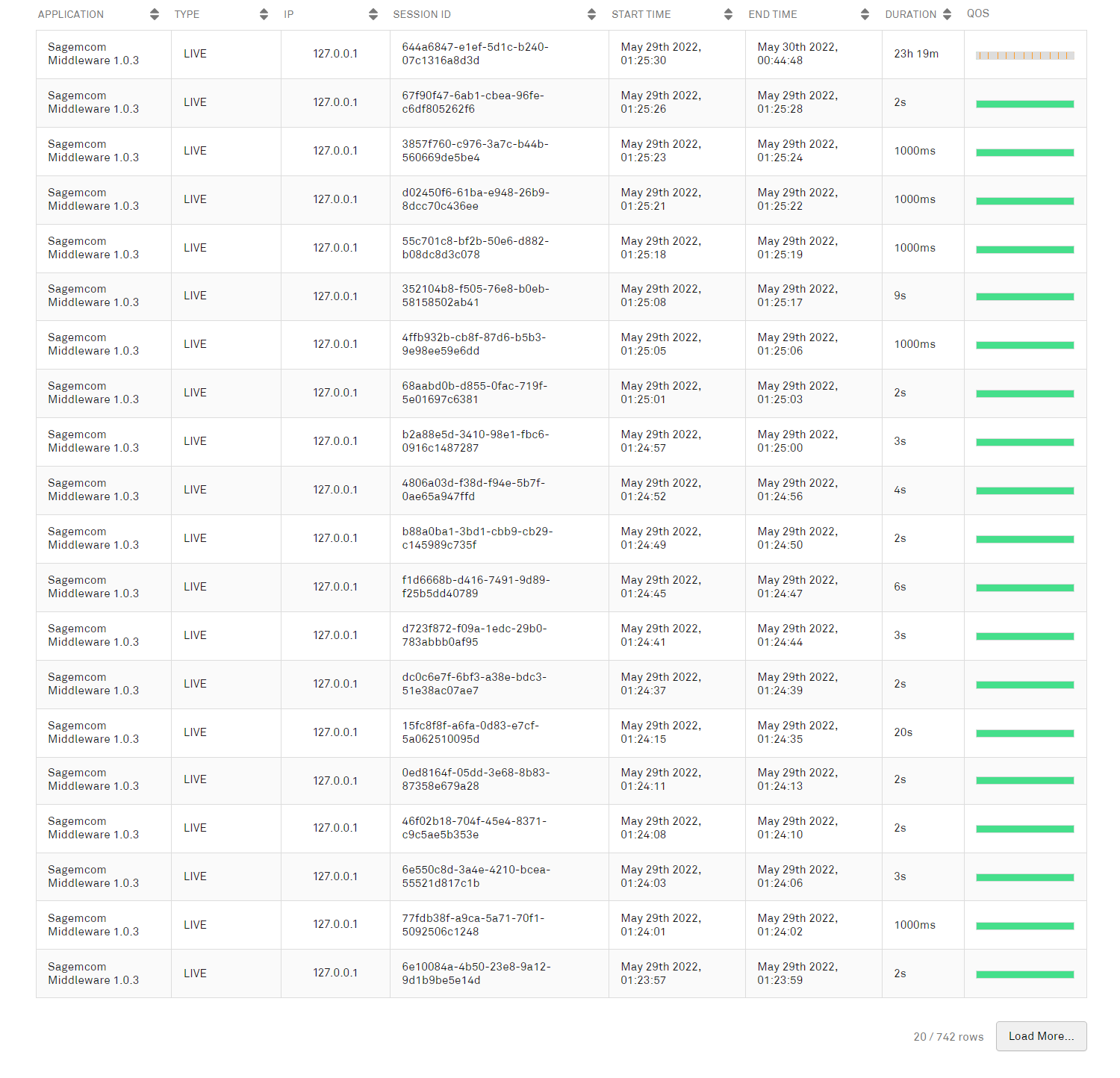 The table lists the sessions for the device.