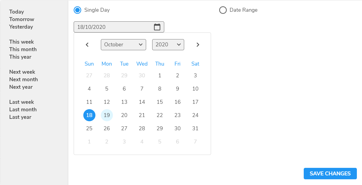 You can select the day from YESTERDAY, TODAY or TOMORROW on the left, or select the Single Day radio button and choose the required date.