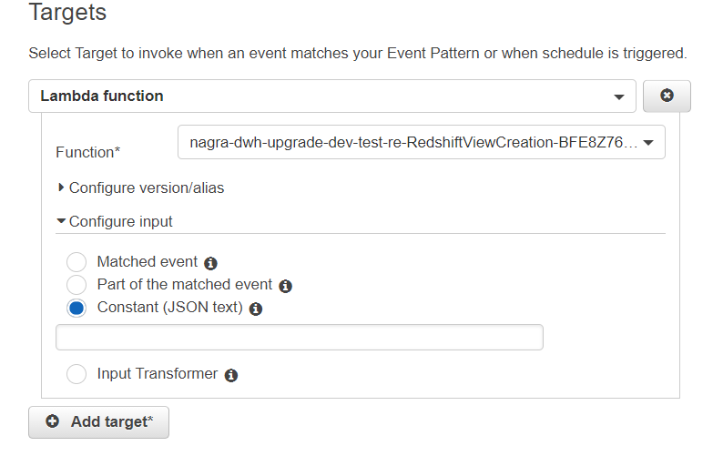 - Select the target for the Lambda function created for the data extract, for example: nagra-dwh-upgrade-dev-test-data-dataExtractHandler-72GUG9U98AS6.