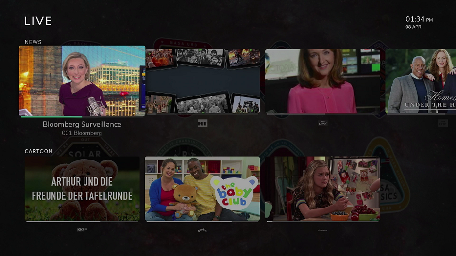 The Live screen allows users to quickly find live content that they’re interested in, with the currently playing items grouped into genres specified by the operator.