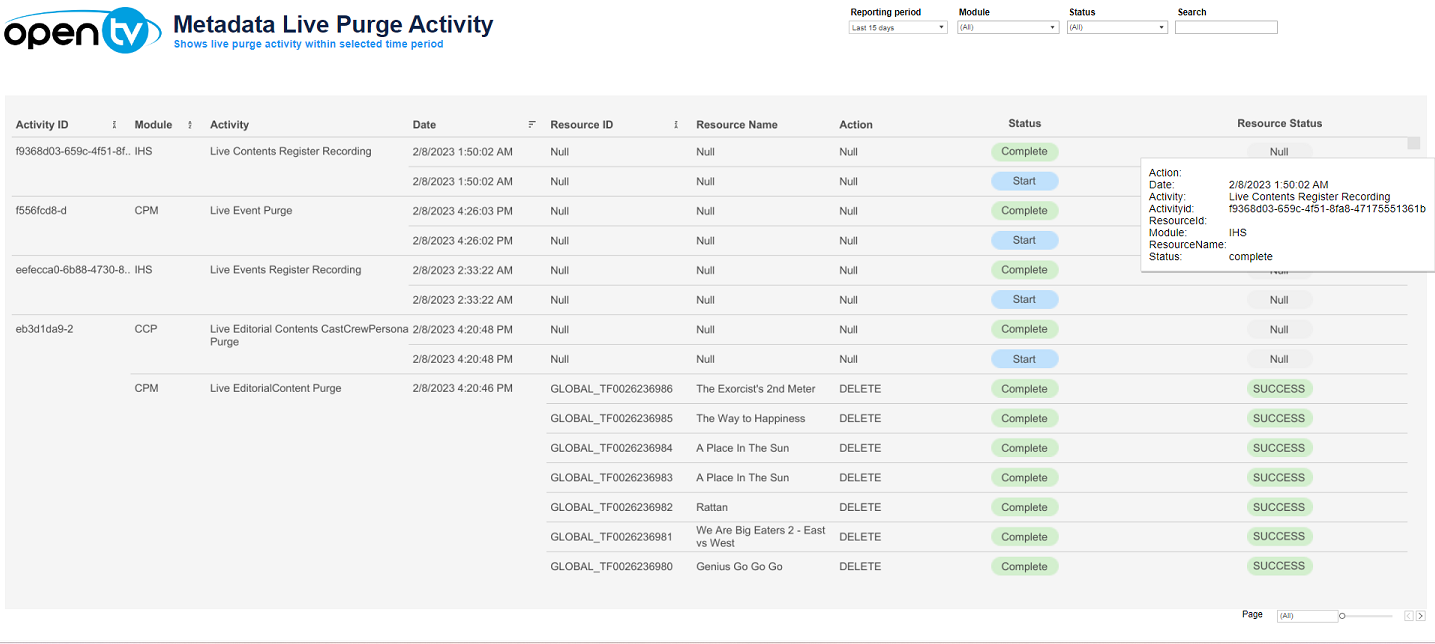 The Metadata Live Purge Activity report shows the status of live purge activities in all OPF3.x modules such as CCP, CPM, UAV and IHS. For each activity, it shows: