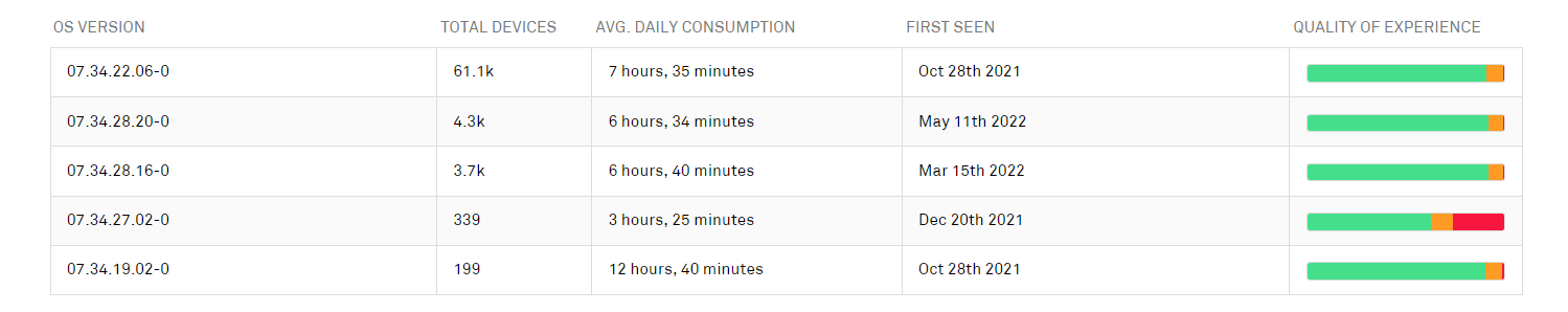 This table shows the five most-used versions of operating system for the device platform. There is no mouse-over or other functionality for this table.