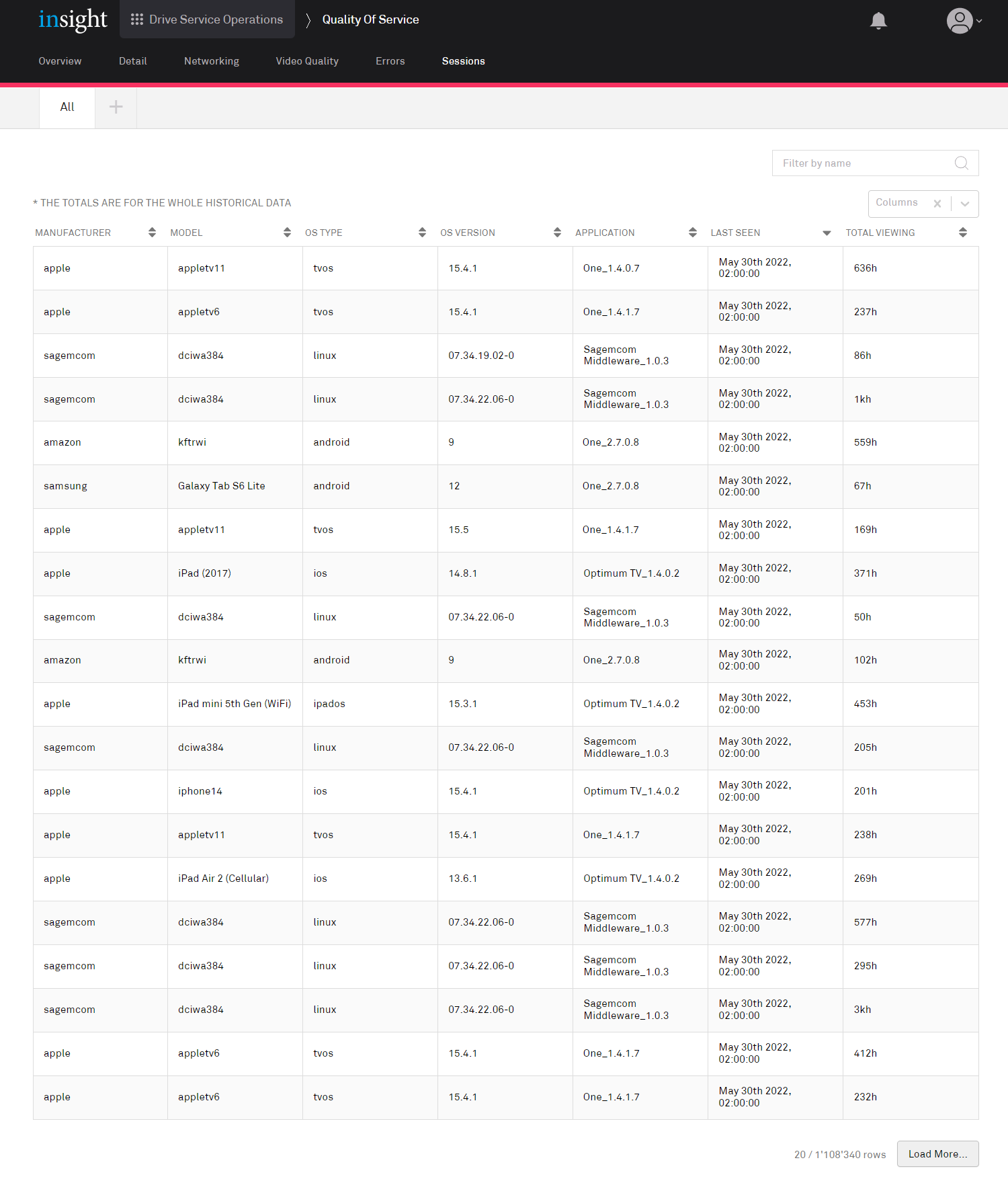 This page shows the sessions for the devices in use; clicking a row in this table opens the detailed information page for that device.