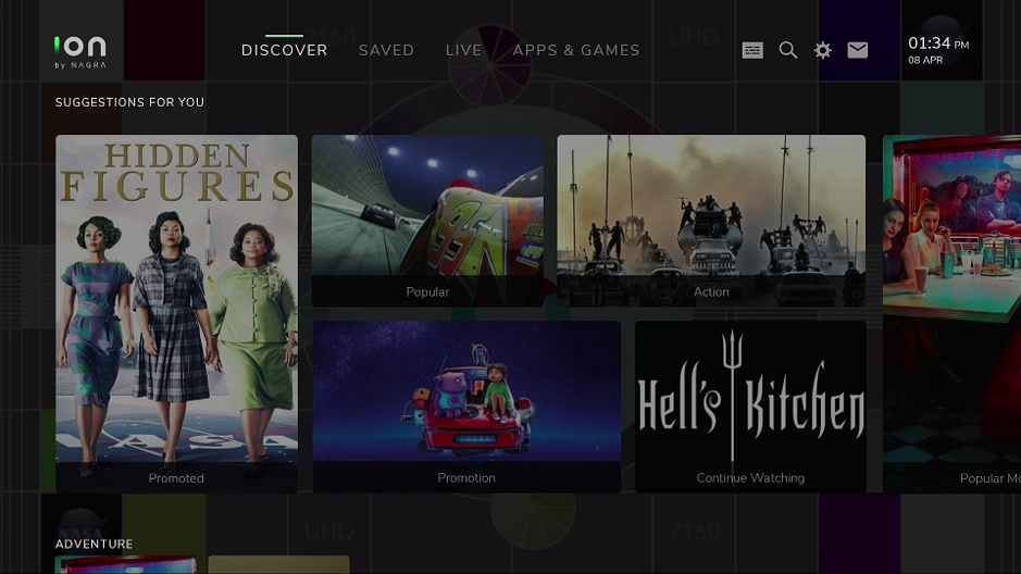 Discover is our modern browsing offering, allowing users to find content via beautiful imagery and data-driven menus. A combination of recommendations and operator-promoted content provides a gallery of items tailored to the user.