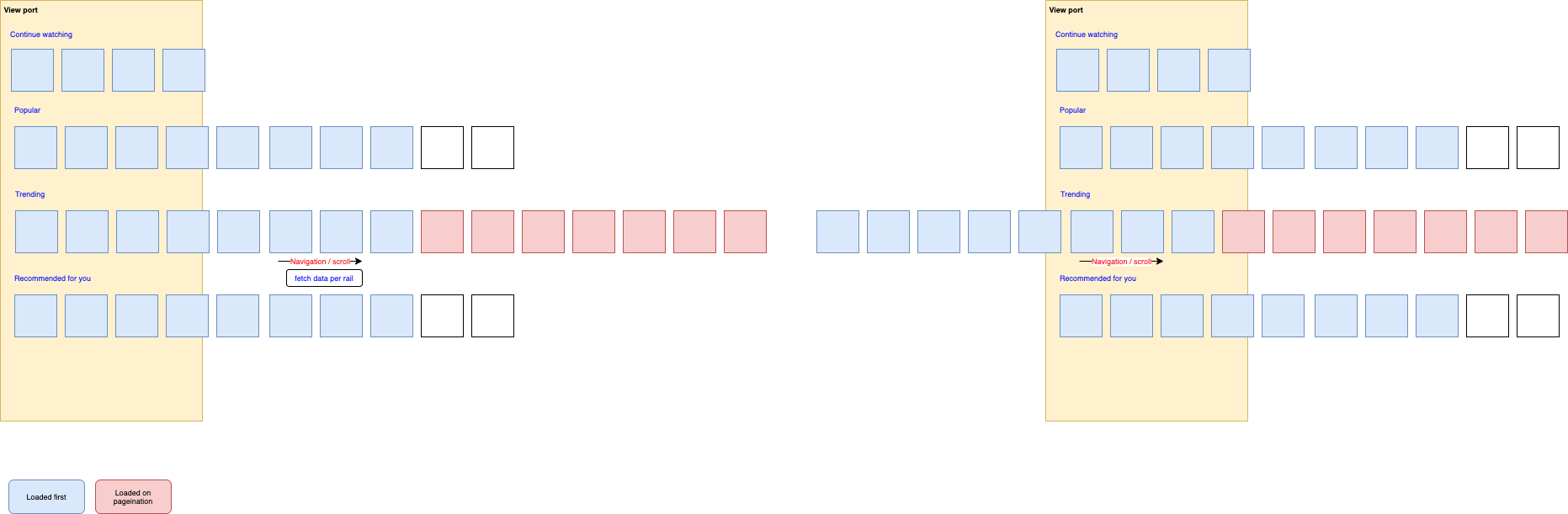 The CDS rails APIs provide the functionality to show the screen with rails as a landing page screen in one shot. It also includes pagination. At boot up or on refresh as in Fig 3 the template would be fetched with all the content. When the user paginates into the next part of the row by touch or remote interaction, the remaining data would be fetched for showing to the user.