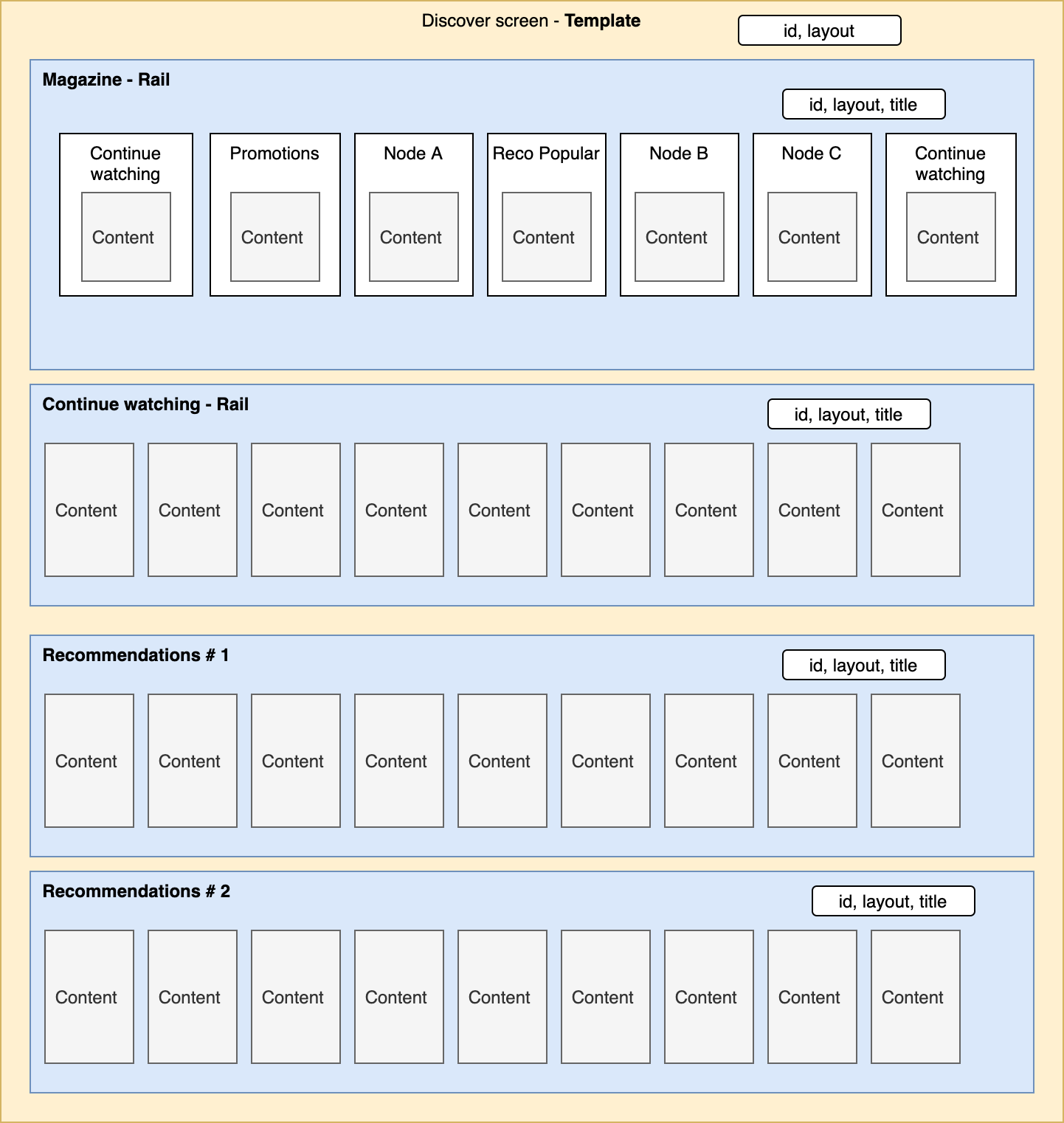 As an example, the main screen of an interface could have a rails configuration to show the following; continue watching, recommendations use-cases, etc.