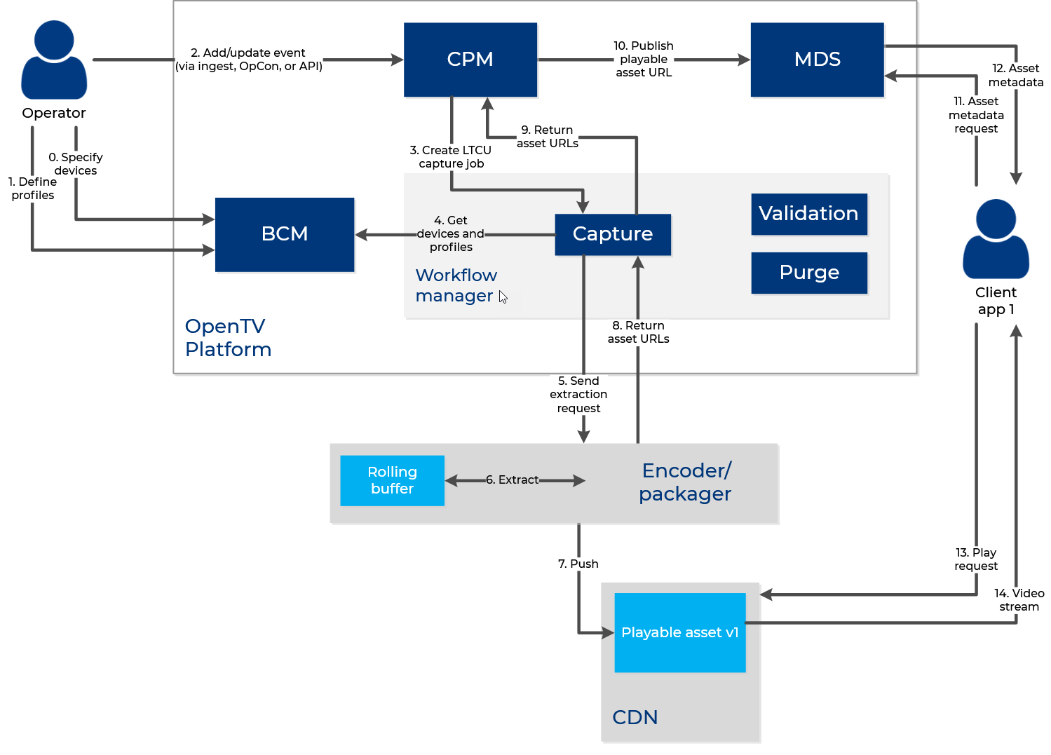 The following diagram shows the main interactions between the Content Workflow Manager (CWM), the Business Configuration Manager (BCM), the external encoder/packager, the CDN, and so on for the single-stage LTCU workflow:
