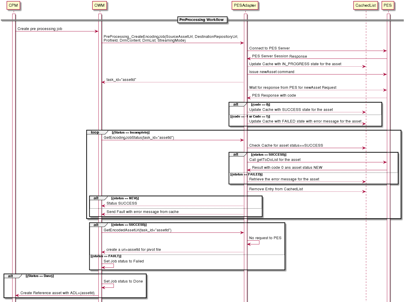 The todolist is checked for Assets with NEW status by issuing a newAsset command and polling with a getToDoList request (see PES integration). Based on the status, the preprocessing job is marked as Done or Failed.