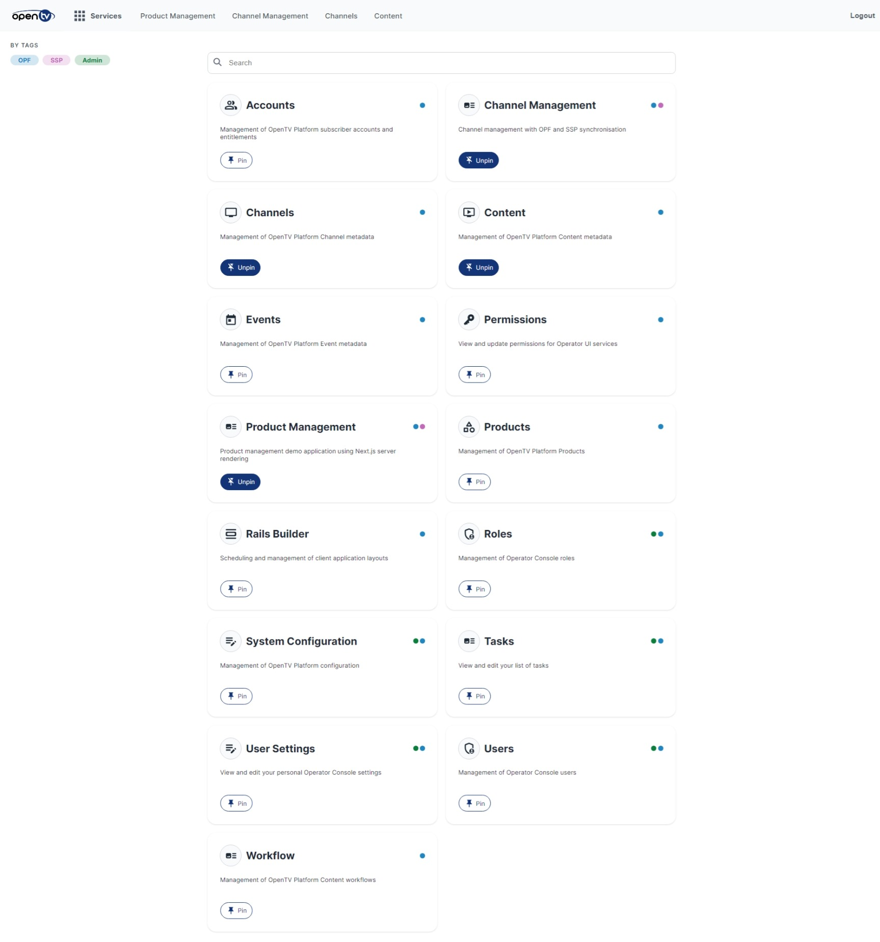 The dashboard page displays the services available and comprises existing OpCon and new OPF/SSP channel and product management services.