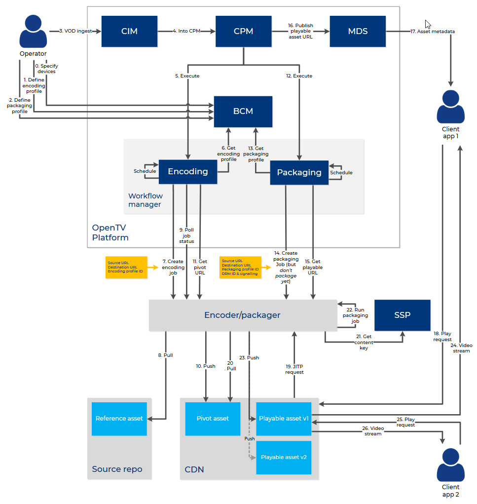 The following diagram shows the main interactions between the Content Workflow Manager (CWM), the Business Configuration Manager (BCM), the external encoder/packager, the CDN, and so on for the two-stage VOD workflow with JITP: