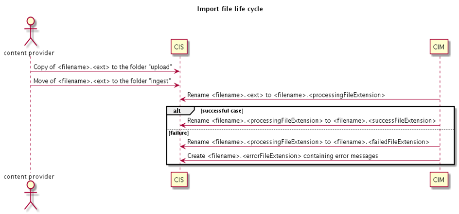 The CMS import is deployed as a Content Importer (CIM) that runs on a regular basis. When launched, the CIM importer retrieves the list of files to be processed by examining a specific configured directory, looking for data files whose name match a specific pattern (generally *.xml). This directory is located on a file server accessible to the CIM. FTP/SFTP protocol is supported as well as direct file access.