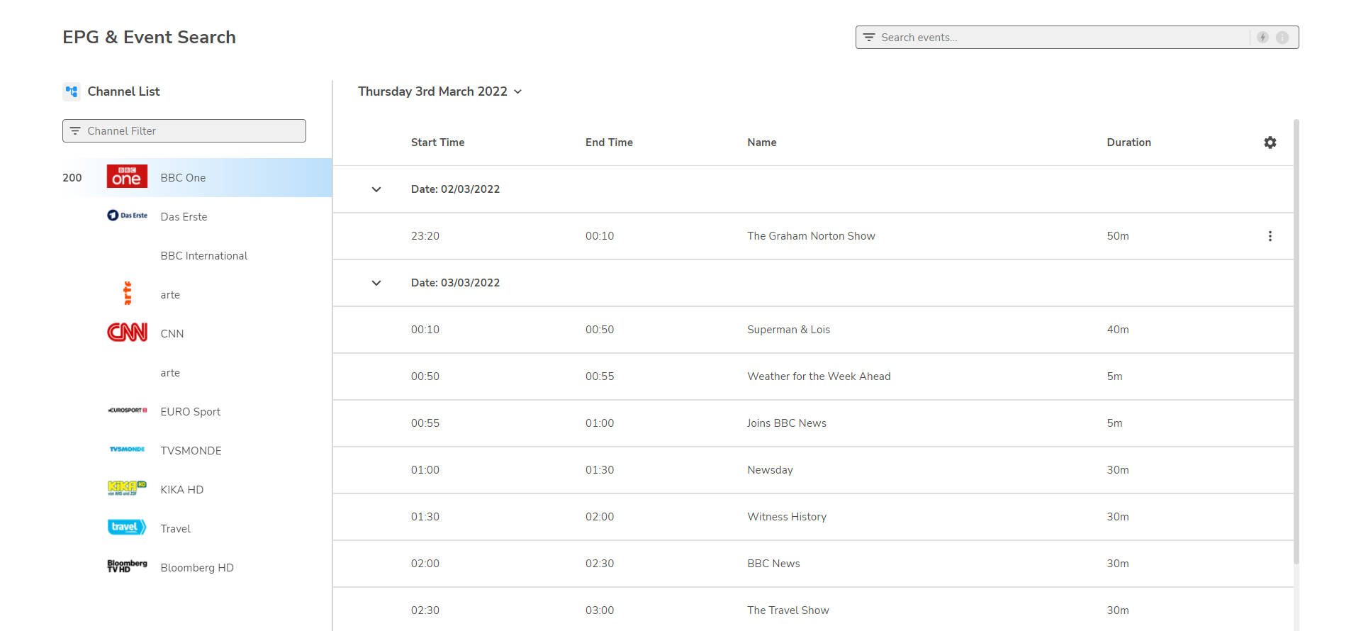 To view the EPG & Event Search page, from the dashboard page, select Events.