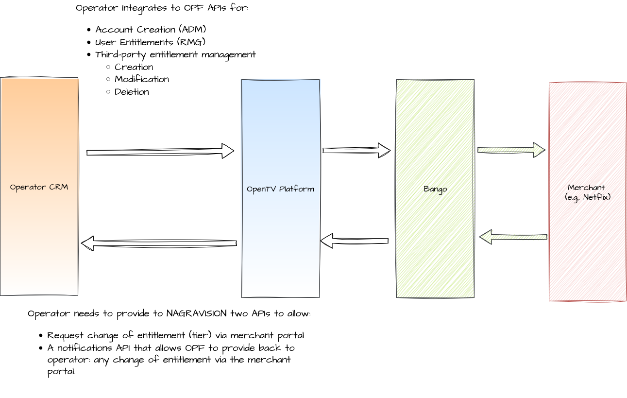 When a customer purchases a third-party product in this way, OpenTV Platform creates its own entitlement and also calls Bango to create a Bango entitlement for the product. Bango, in turn, enables the third-party service for the customer. This is illustrated in the following diagram: