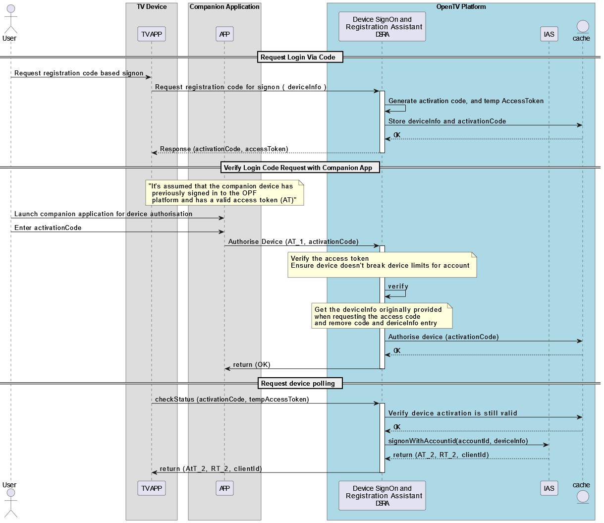 OpenTV Platform supports signing on via a companion device. For example, to sign in on a smart TV, the app on the smart TV can generate a code that user enters on the operator’s app on their phone (which is already signed in to the service).