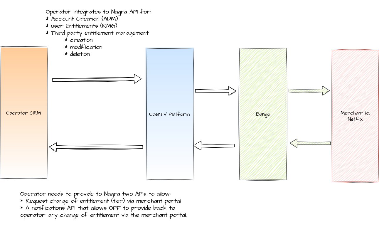 When a customer purchases a third-party product in this way, OpenTV Platform creates its own entitlement and also calls Bango to create a Bango entitlement for the product. Bango, in turn, enables the third-party service for the customer. This is illustrated in the following diagram: