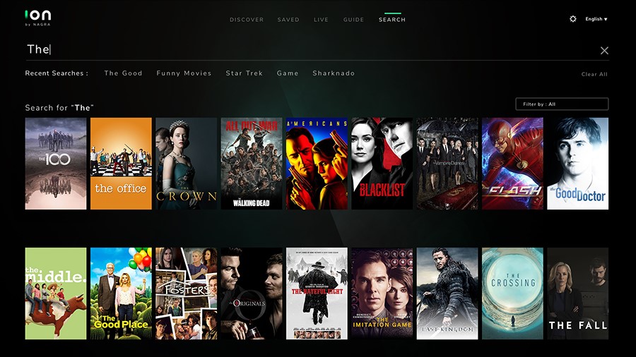 As shown below, the ten-foot design version enables the user to browse the TV shows and movies across available sources, live TV, VOD, etc. In each type, the latest content available to the user is provided.