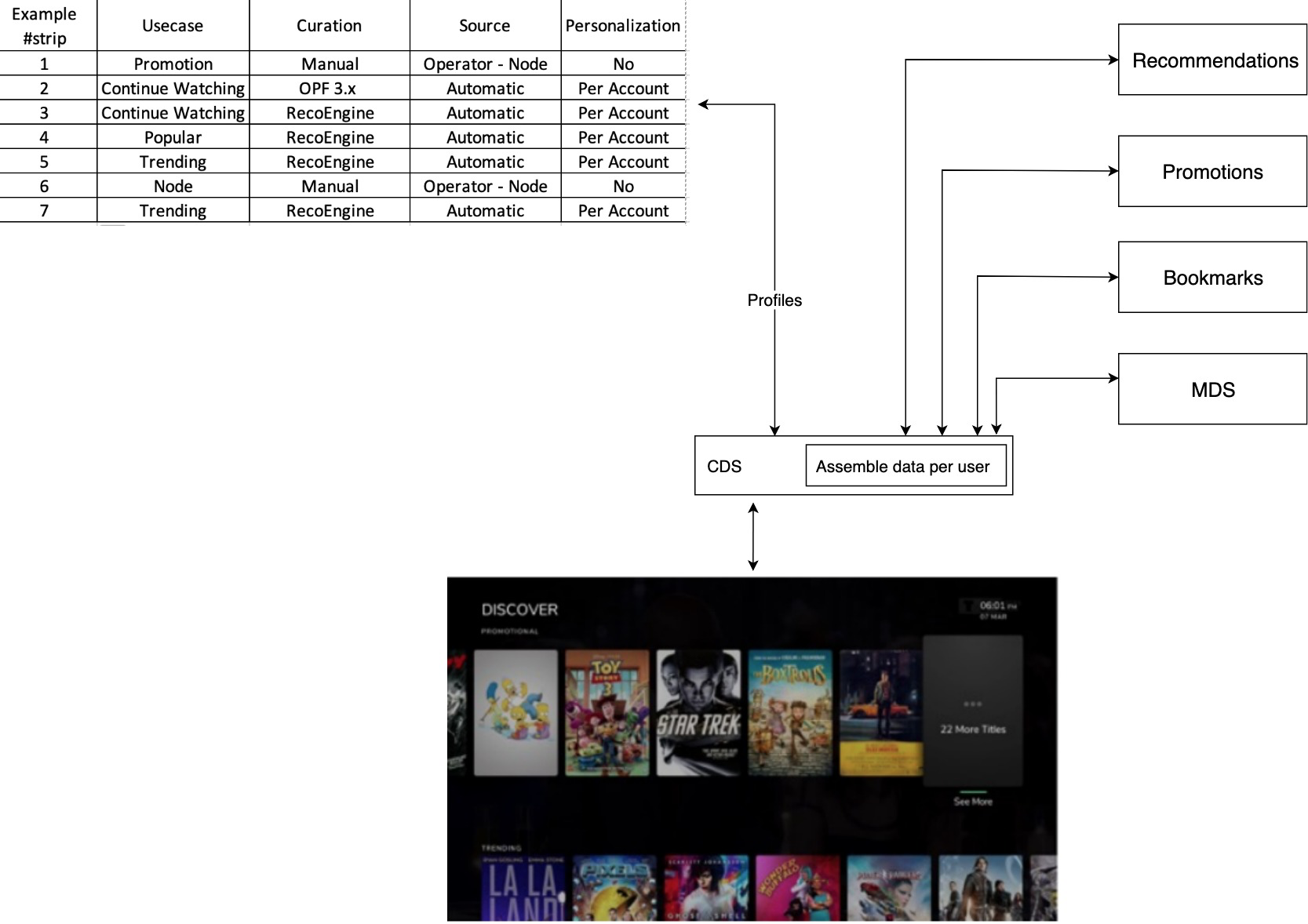 An API driven by content grouping type (e.g., popular, trending, continue watching, etc.; shown as "Usecase" in the following diagram) that provides a list of content to be shown to the user.