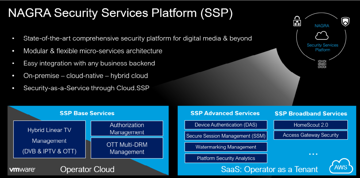 The NAGRA Security Services Platform (NAGRA SSP) is a newer generation security platform enabling a comprehensive approach to security through its content and service protection features in Pay-TV. It is designed to address the current Pay-TV market challenges and the future needs that NAGRA believes are part of the ALL-IP transformation happening in the industry.
