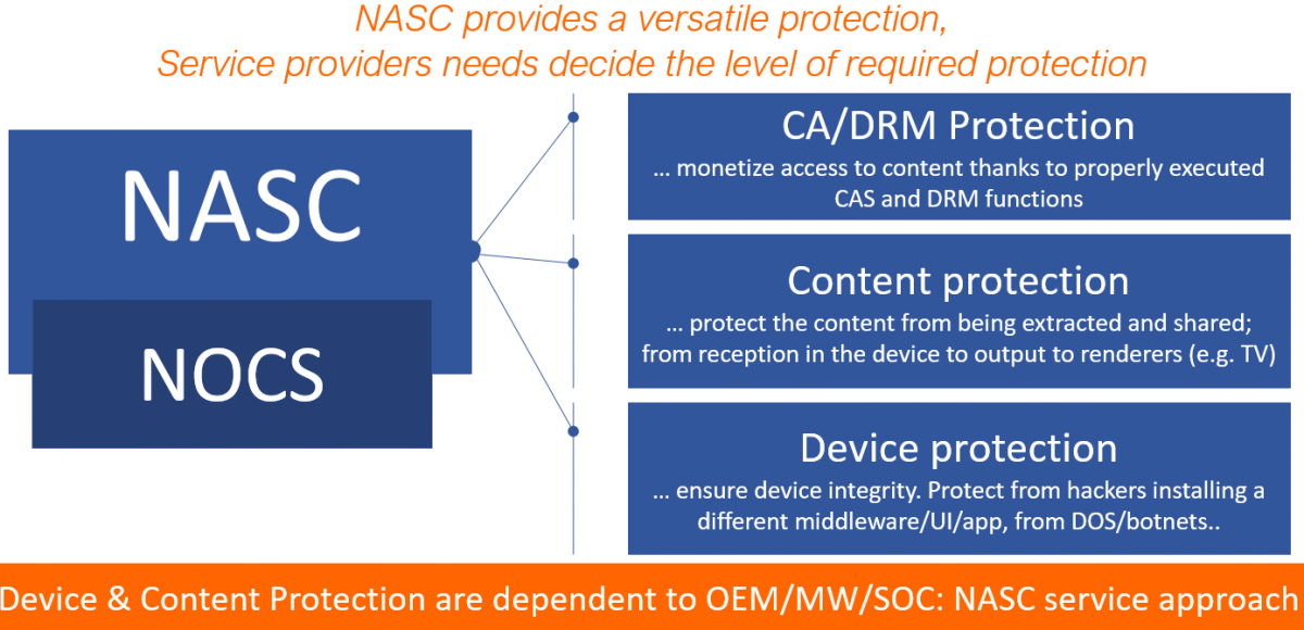 NASC is a set of security requirements to be implemented by device and middleware providers to be protected against certain types of attack. NASC requires the use of a NOCS chipset. In basic terms, NASC allows you to protect CAS and DRM assets, the device itself, boot loaders, software download mechanisms, and other software stacks.