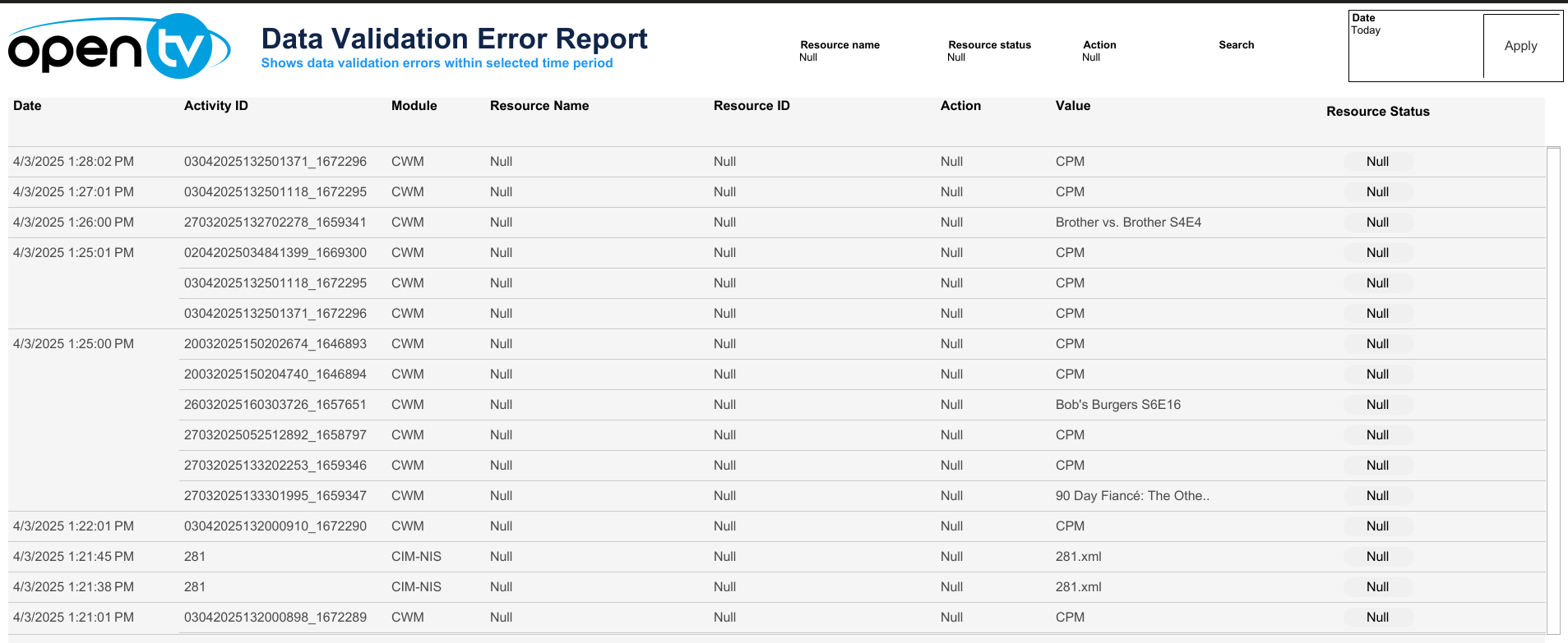 The data validation error report is a table that lists the validation issues (errors or warnings) that occurred during the specified date range for the selected filters. For each entry, it shows: